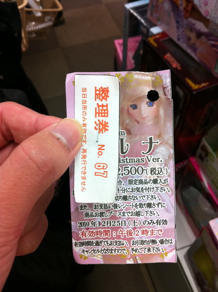12.25是一个特殊的日子,大家都知道这一天是ドルパ24 的アフターイベント(其实大家只知道那天是圣诞节),然后呢,还是为了爷的骑士姬再次踏上了征途。为了避免早去还抽个杯具号的情况,这次没有选择乘坐始电,其实也非常之早就出了门,果然爷还是不够蛋定,七点半就到了秋叶原,一出站就看到有人已经排着了,大概几十号人。 安静跑去最后尾,在抱怨今天好冷的同时,发现爷身边的国人超过半数,并且很多就长着个倒爷的脸。唉,又要跟一群倒爷抢莉莉了。