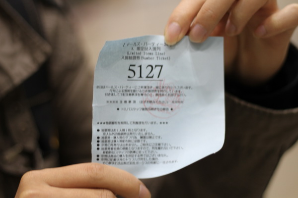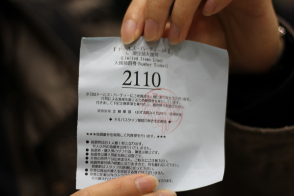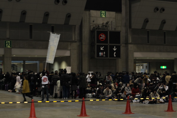到九点的时候,限定贩售开始,那时周围已经全是人了,他们都是从哪跑出来的啊,喂,爷的骑士姬怎么办啊。身边也时不时能听到国语,好多国人手上拿着一摞子票,都是来赚钱的吧,那么冷的天出来干活,真是辛苦你们了。贩售的队列是以一百号为单位的,看着前一百号进场的时候,爷好生羡慕,从来没那么羡慕过别人。